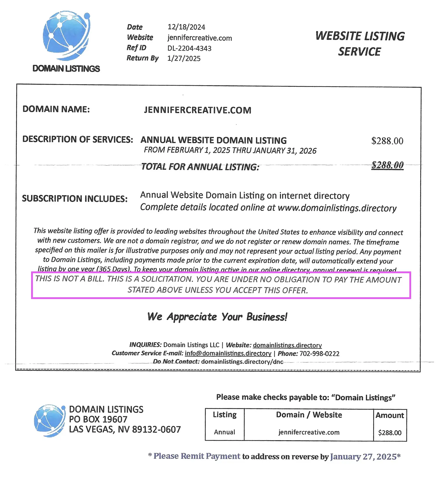The notice I got today was for a “directory listing”. While the practice of selling listings isn’t illegal and some might very well be legitimate, this one in particular works really hard to make it SEEM like it’s a domain renewal. They’re hoping that I don’t read any of the fine print and just send in my money to renew the domain. Disregard and throw it in the trash!